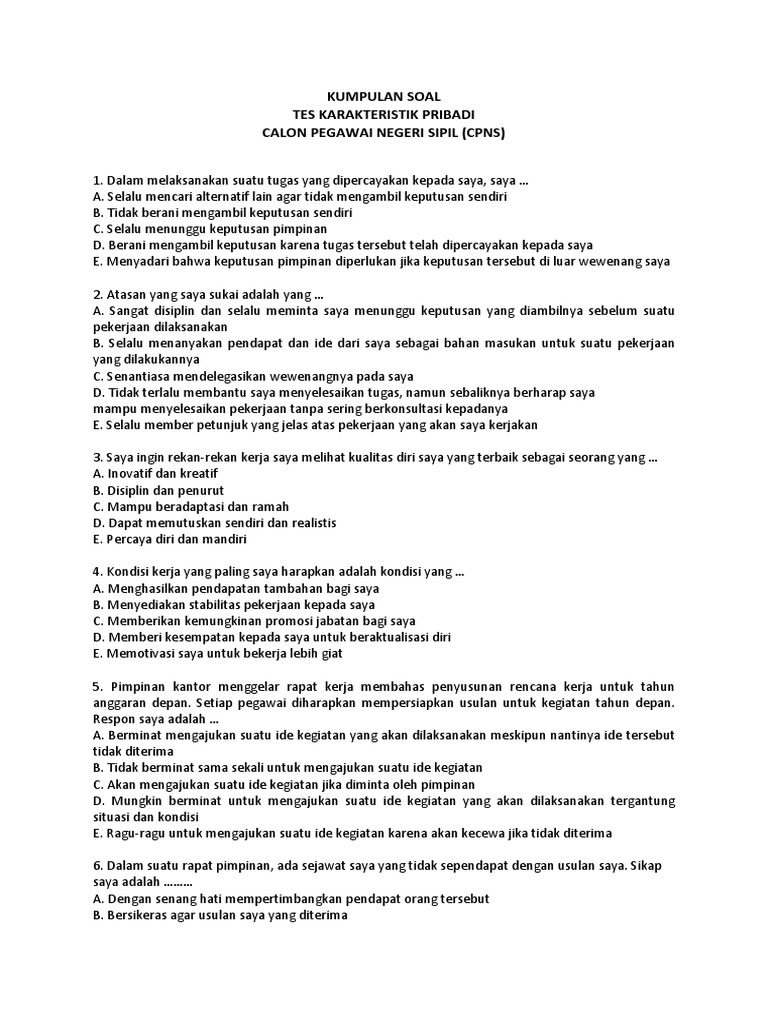 Akan tetapi secara garis besar, sebagian soal yang diujikan masih mengikuti tahun sebelumnya. Setiap hari, saya masuk kantor paling cepat dibandingkan pegawai lainnya. Selain itu, kreativitas dan inovasi. Contoh soal cpns 2018 pdf wawasan kebangsaan. Andika bukan karyawan yang pegawai tetap c. Tes penerimaan cpns terdiri dari seleksi kompetensi dasar (skd) dan seleksi kompetensi bidang (skb). Seperti yang disampaikan sebelumnya bahwa salah satu kelulusan yang harus dicapai adalah tes seorang pns dituntut memiliki kedewasaan diri yang tinggi sehingga pada salah satu soal tes yang diujikan berisi materi karakteristik pribadi yang. Contoh soal tes cpns 2018 karakteristik pribadi. Kelompok soal ketiga adalah tes karakteristik pribadi (tkp). Soal cat cpns tes karakteristek pribadi (tkp) merupakan sebuah tes psikologi yang meneliti jenis dan karakter kepribadian para peserta cpns dalam berbagai aspek, termasuk aspek kognitif dan aspek emosi. Lowongan cpns 2018 sudah mulai di buka dan persaingan untuk lulus dalam seleksi berkas dan psikotestpun sudah mulai dipersiapkan. Alokasi formasi cpns kemenag 2018. Bocoran dan latihan soal tkp cpns 2018 dan full pembahasan latihan soal tes karakteristik pribadi (tkp) cpns 2018 part 6.