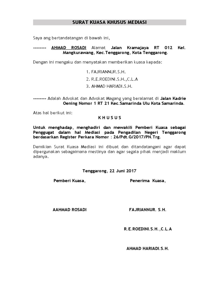 Kepada yth, bapak ketua pengadilan negeri jakarta pusat. Contoh surat kuasa pengacara untuk kepengurusan hukum contoh surat kuasa pengambilan uang di bank bni, mandiri, bca, bri Cek dulu contoh surat kuasa yang baik dan benar]. Untuk mewakili pemberi kuasa sepenuhnya sebagai penggugat dalam perkara perdata kewarisan di demikian surat kuasa ini diberikan dengan hak retensi dan tidak dapat dicabut kembali tanpa persetujuan tertulis dari penerima kuasa. Perjanjian pemberian jasa hukum (konsultan hukum). Gusti ayu sumiarti umur : Contoh surat kuasa khusus pengambilan bpkb, gaji, uang, ijazah, paspor, dokumen, barang. Yang bertandatangan/cap jempol di bawah ini : Untuk mewakili pemberi kuasa sepenuhnya sebagai penggugat dalam perkara perdata perbuatan melawan hukum melawan pt. Surat kuasa secara umum surat kuasa diatur dalam bab ke enambelas, buku iii kuh perdata dan secara khusus diatur dalam hukum acara perdata hir dan rbg. Kasus perceraian memang tidak sedikit terjadi. Contoh surat kuasa yang benar dan turorial lengkap cara membuatnya. Hal tersebut juga sering diajukan gugatan resmi untuk membuktikan kasus arbitrase termasuk sengketa yang bisa diselesikan secara perdata yang berada diluar peradilan umum, berikut adalah contoh surat kuasa.